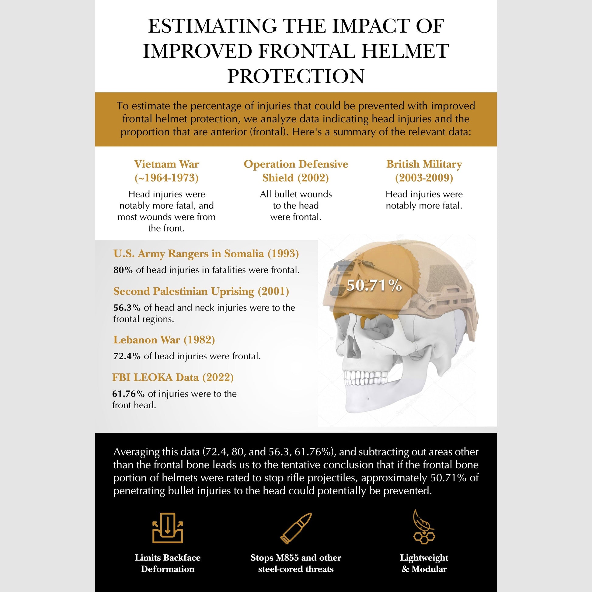 The HHV ATE® Rifle, proudly made in Sweetwater, Texas, is the only rifle rated helmet that not only stops rifle threats (including 5.56 M855 Green Tip), but keeps backface deformation to an acceptable level. Combat and police casualty data show that prioritizing frontal skull protection in helmets can dramatically reduce fatalities by up to 50%. The helmet shell (1.6lbs) is made up of UHMWPE and aramid fibers, while the up-armor is made of Silicon Carbide. The helmet utilizes our Micro Lattice Pads to maximize comfort and further decrease backface deformation.